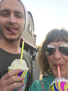 2. I took exactly one break from my delivery today to go fill up my slurpee cup with my son. The surest way to coax laid back Morgen from the farthest reaches of the lap top, that stopped charging lately, is to make a big production of picking out a clamp from Home Depot. I pull over, sunglasses and all, and emerge a sputtering, giggling goof-head. He goes wild with laughter and runs home to mess with Skip.